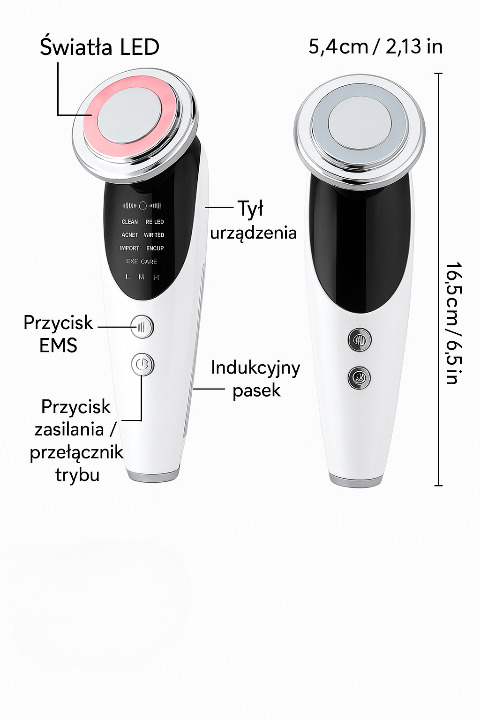 Urządzenie pomaga poprawić jędrność skóry, zmniejszyć widoczność zmarszczek, wyrównać koloryt oraz poprawić elastyczność skóry. Dzięki technologii EMS i RF możesz osiągnąć efekt liftingu bez inwazyjnych zabiegów.